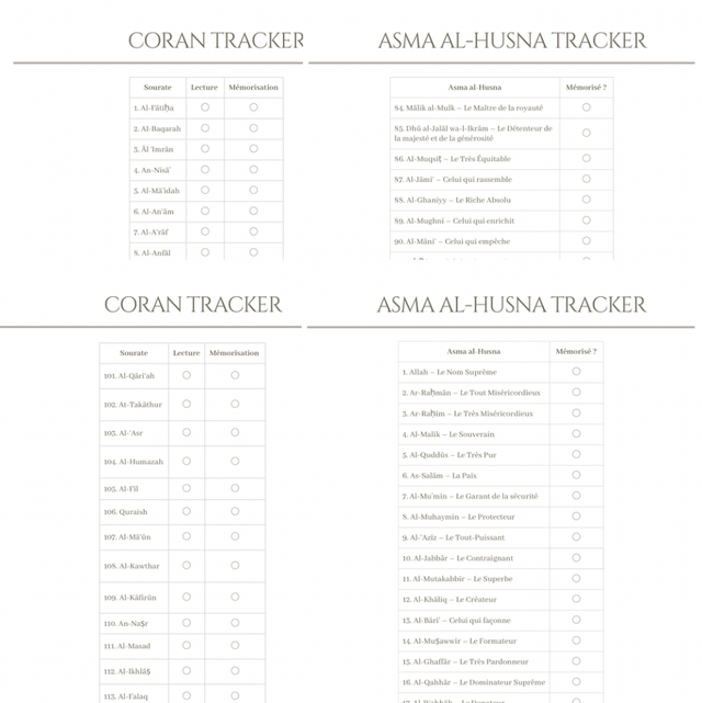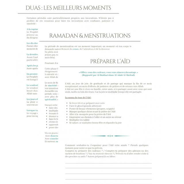 Organisé en 3 parties, il t’accompagnera jour après jour pour vivre ton mois avec intention et sérénité, structurer tes priorités, suivre tes actes d’adoration et avancer vers la meilleure version de toi-même, Incha’Allah.